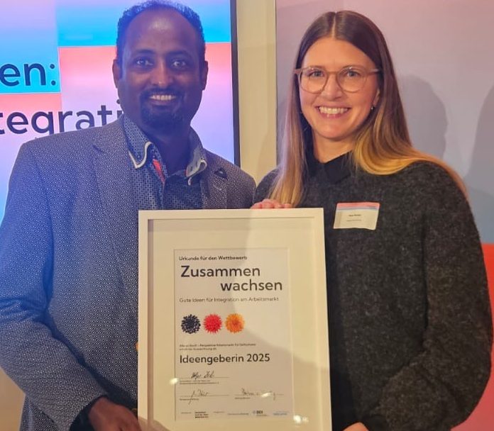 Nun fand Anfang die Dezember die Preisverleihung statt, an der die zwei Berater*innen Efrem Tesfay, Zentrale Bildungs- und Beratungsstelle für Migrant*innen e.V. (ZBBS), und Nele Rinder, Beschäftigungs- und Qualifizierungsgesellschaft Flensburg mbH (bequa), stellvertretend für unser Netzwerk teilnahmen. Nele Rinder berichtet von der Veranstaltung: